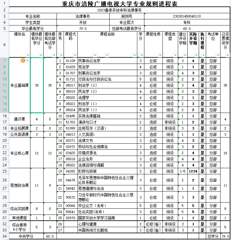 涪陵电大2023年春教学执行计划 开放专科法律事务