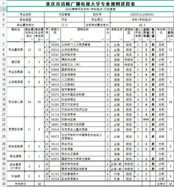 涪陵电大2023年春教学执行计划 开放本科(专科起点)行政管理