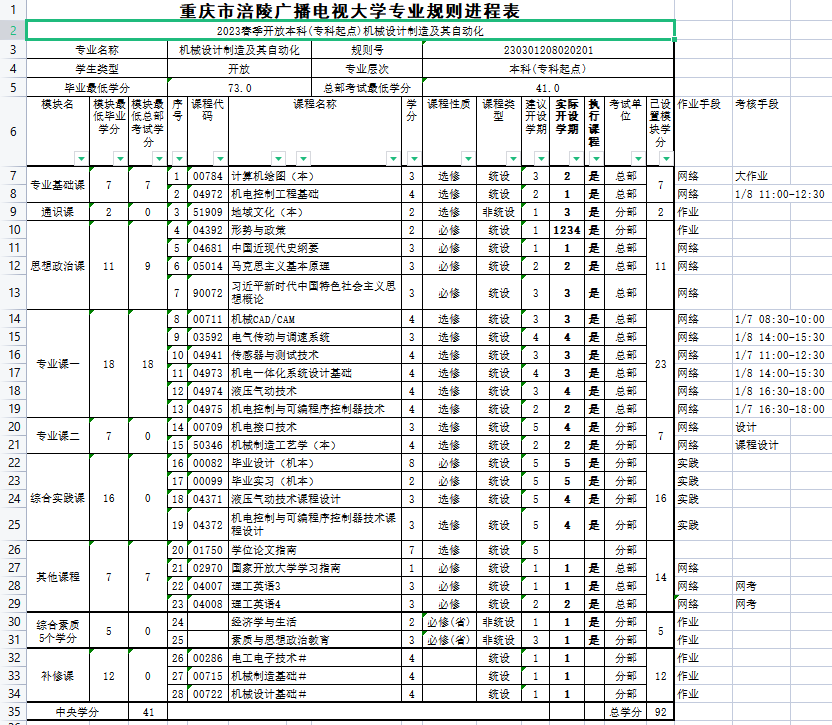 涪陵电大2023年春教学执行计划 春季开放本科(专科起点)机械设计制造及其自动化