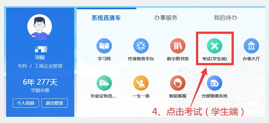 依次点击 “考试(学生端)” — “个人中心”,进入个人中心后点击左侧“资料下载”,确认是“2025年春季学期统一期末考试”后,点击准考证右上角的“下载”或“打印”图标。(若无法正常下载或打印准考证请及时与班主任老师联系)