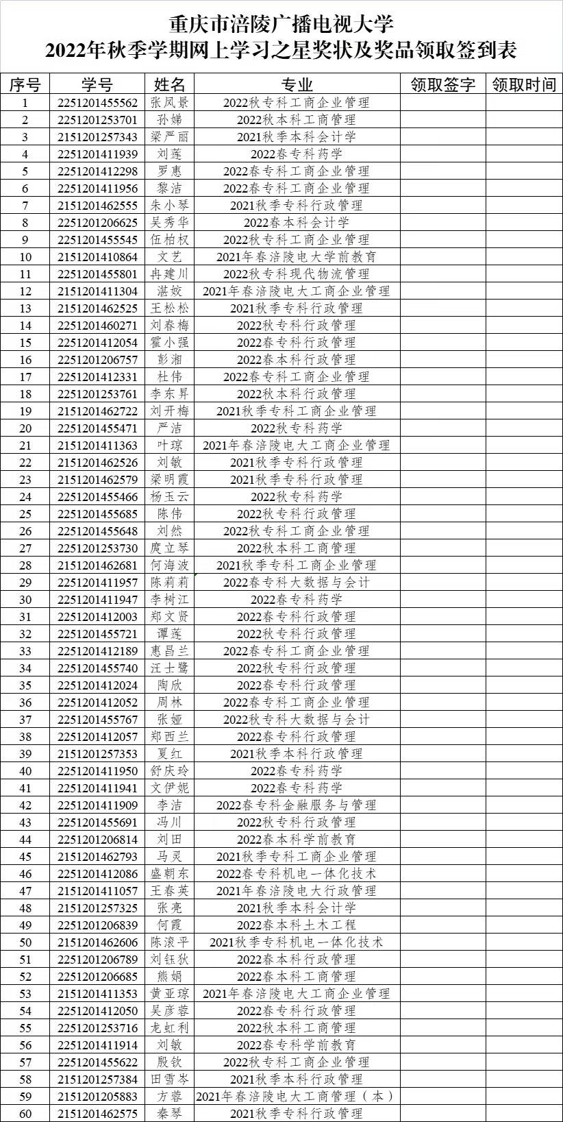 以下是涪陵电大2022秋季学期网学之星、2021年度国开大奖学金以及2022年春季学期重开大网学之星的学生获奖名单,请涉及到以上获奖学生的管理教师到教学处将奖状及奖品领取,将奖状及奖品发到获奖学生手中!