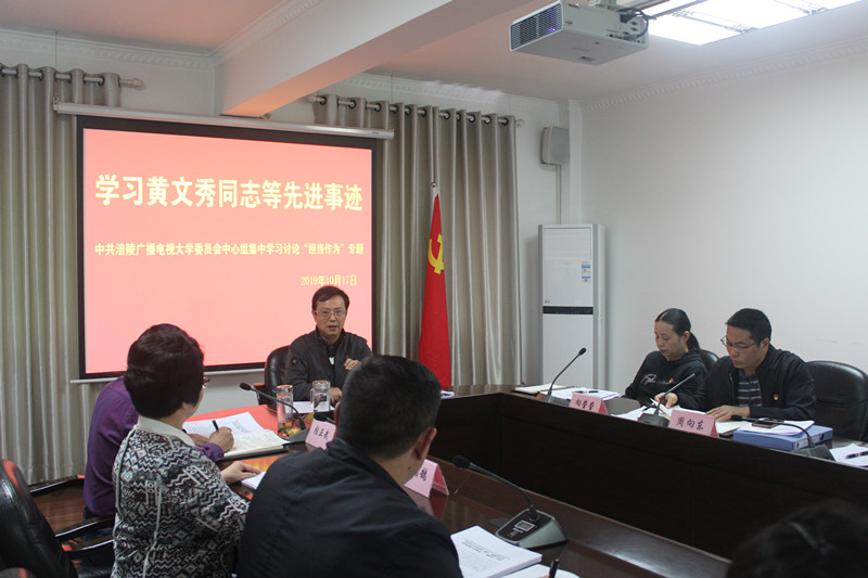 10月17日下午3:00点,我校党委理论学习中心组(扩大)召开“担当作为”专题学习讨论,除个别干部因公外出,其他中层以上干部全部参加。党委书记、校长邹信原文领学了习近平总书记2019年9月在中央党校(国家行政学院)中青年干部培训班开班式上发表的重要讲话,领学了陈敏尔唐良智到涪陵区调研并指导第二批主题教育的讲话精神,并观看了黄文秀同志先进事迹视频。党委委员、纪委书记周鸿鹄主持会议。