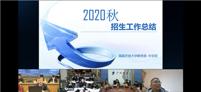 近日,国家开放大学召开了2021年春季招生工作视频会,国家开放大学教务部部长叶志宏参加,国家开放大学教务部副部长陈鲲主持会议。我校党委委员、副校长田小平、招生办主任陈锐、继教中心主任王岭等相关部门负责人和合作发展处所有成员以远程视频参会的方式收视了会议,学习和领会会议精神。