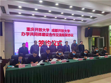 随后,在结对签约仪式上,颜书记代表我校与成都开放大学双流学院签订川渝开放大学办学共同体建设合作交流框架协议,拉开了两校合作发展的序幕!通过结对,使两校在今后的发展中实现信息互通,项目互动,资源成果共享,共同发展的美好局面。