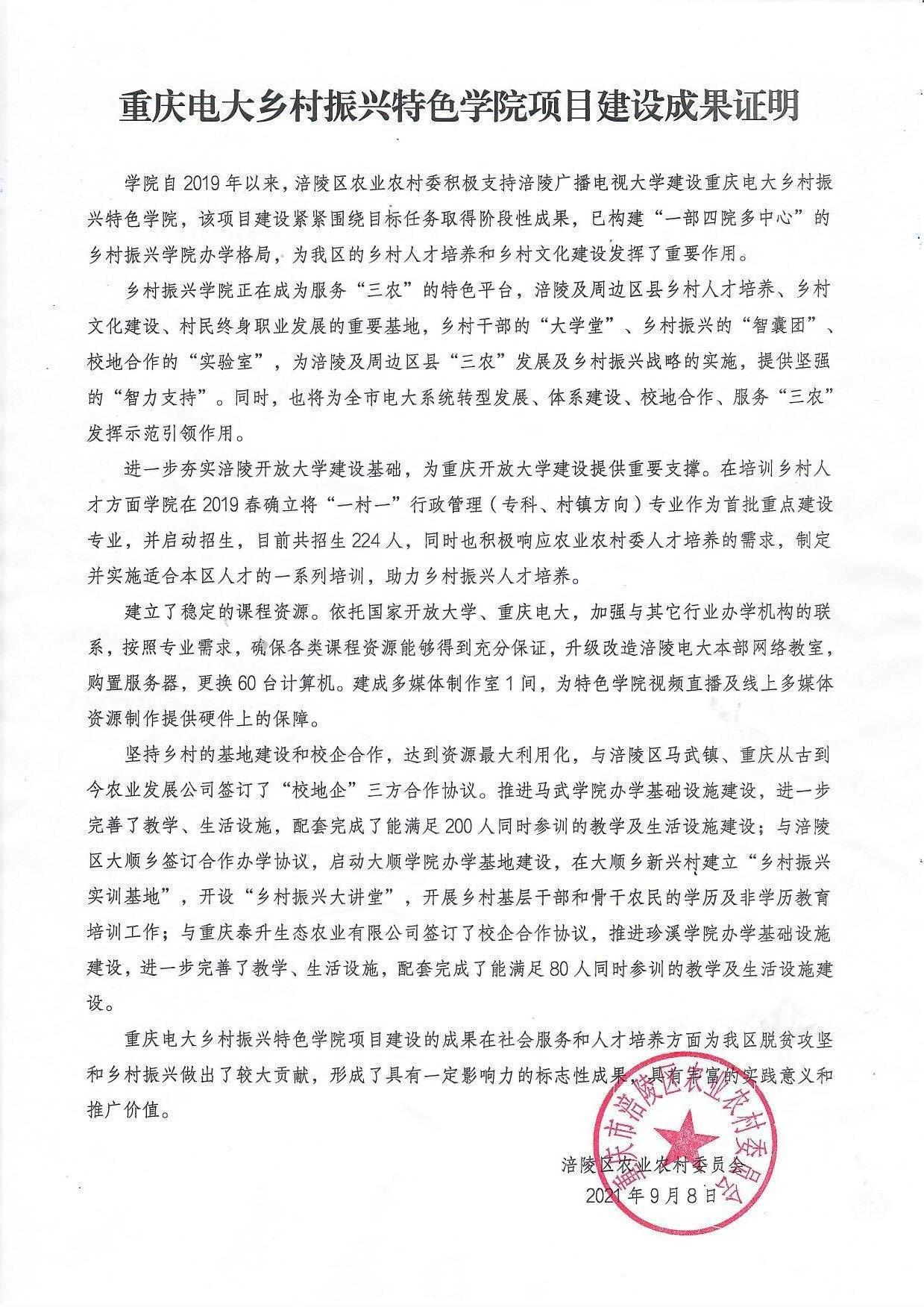 重庆电大乡村振兴特色学院项目建设成果证明 涪陵区农委