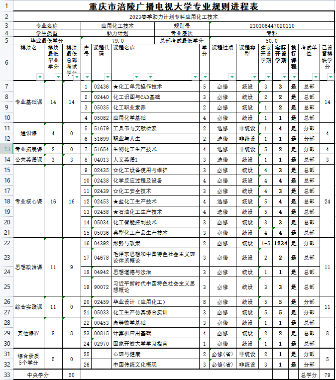 涪陵电大2023年春教学执行计划 助力计划专科应用化工技术