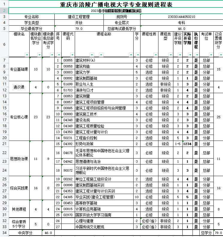 涪陵电大2023年春教学执行计划 开放专科建设工程管理