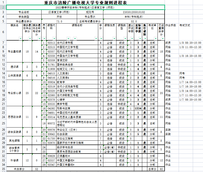 涪陵电大2023年春教学执行计划 开放本科(专科起点)汉语言文学(师范)