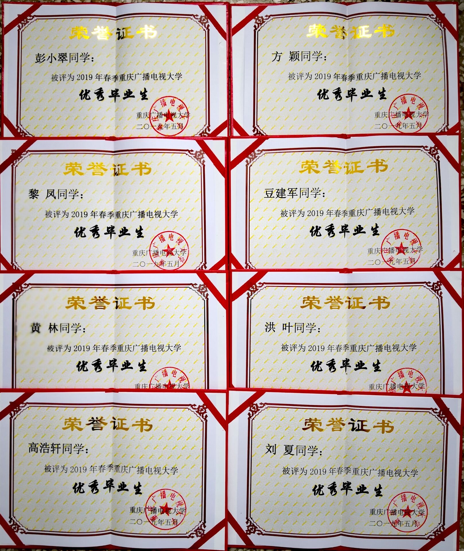 近日,重庆广播电视大学2019年春季优秀毕业生评选结果揭晓,我校彭小翠、方颖、黎凤、豆建军、黄林、洪叶、高浩轩、刘夏等8位同学荣获重庆广播电视大学“优秀毕业生”荣誉称号。