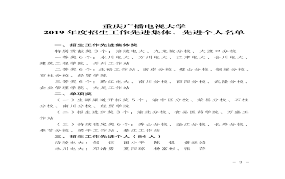 我校被授予“重庆广播电视大学2019 年度招生工作先进集体”荣誉称号
