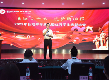 在喜迎党的二十大即将召开之际,9月28日晚,涪陵电大首次采取“线上+线下”的形式面向全校师生举行2022年秋期开学典礼暨优秀学生表彰大会。涪陵电大党委书记、校长颜晓梅同志出席开学典礼并致辞,副校长张正武同志主持典礼并主讲开学第一课。80余名新生代表、优秀学生代表及全校教职工参加了开学典礼。
