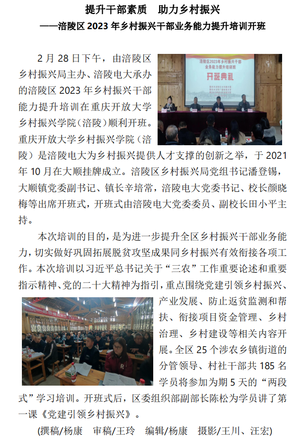 提升干部素质 助力乡村振兴 ——涪陵区2023年乡村振兴干部业务能力提升培训开班